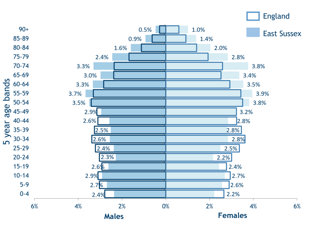 - East Sussex has an older population structure compared to England, with 2.4% of females aged 85 years or over compared to 1.5% for England.