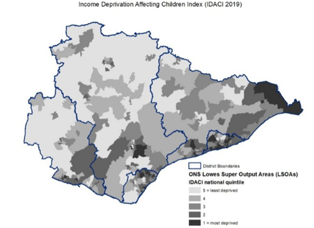 - 19 East Sussex neighbourhoods (LSOAs) are classified as being within the 10% most deprived in England in terms of income deprivation affecting children, and 52 neighbourhoods are in the 20% most deprived in England.