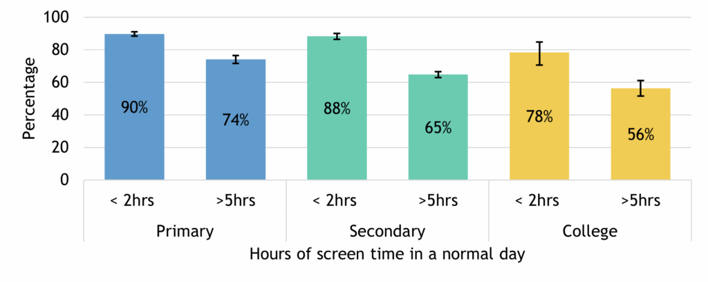 - The daily amount of screen time increases with age, with 21% of primary students reporting spending more than 5 hours a day compared to 34% of secondary and 32% of college students.