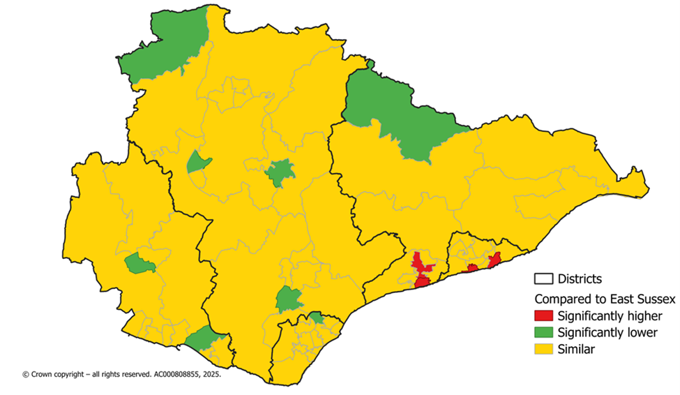 Map 1: Admissions due to unintentional and deliberate injuries, 0-4 year olds, East Sussex MSOAs, 2020/21 to 2024/25